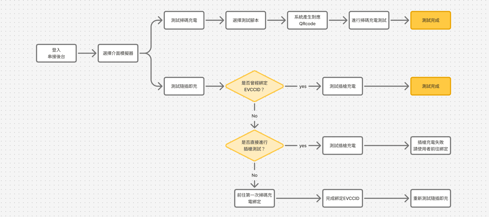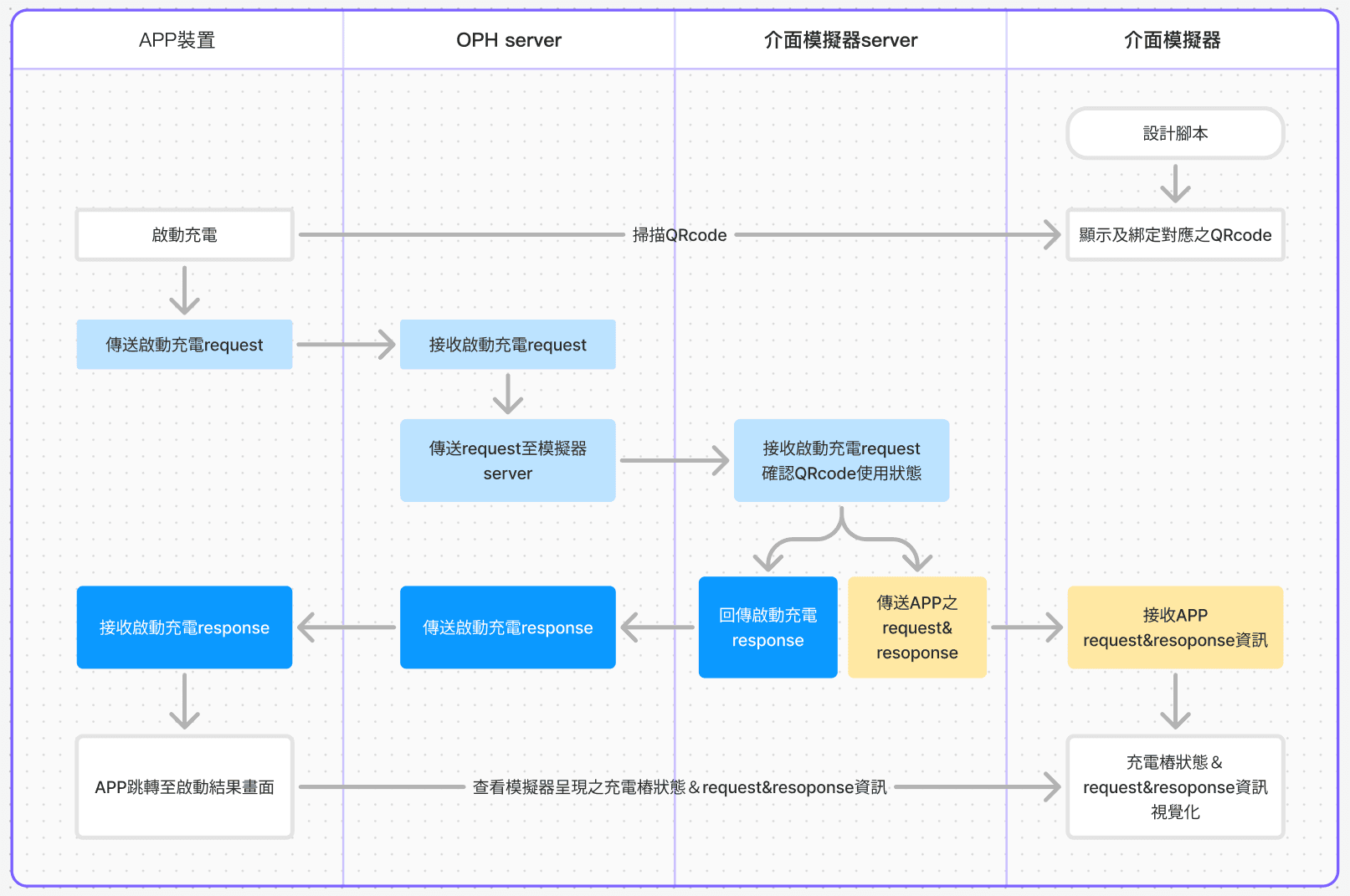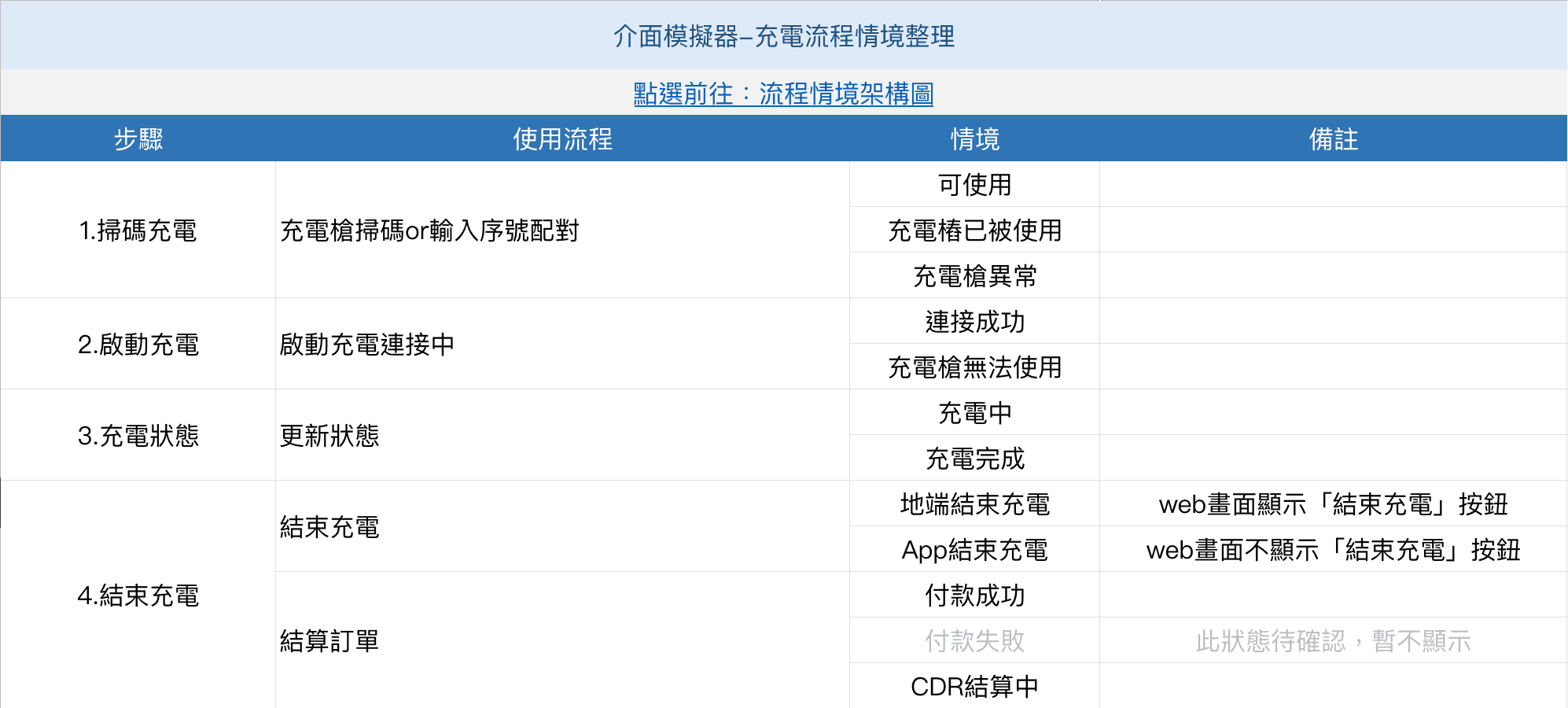 由於測試中無法納入所有情境,我們將完整的充電流程分類為四步驟(掃碼充電-啟動充電-充電狀態-結束充電),保留較重要的狀態後整理出下圖的表格。