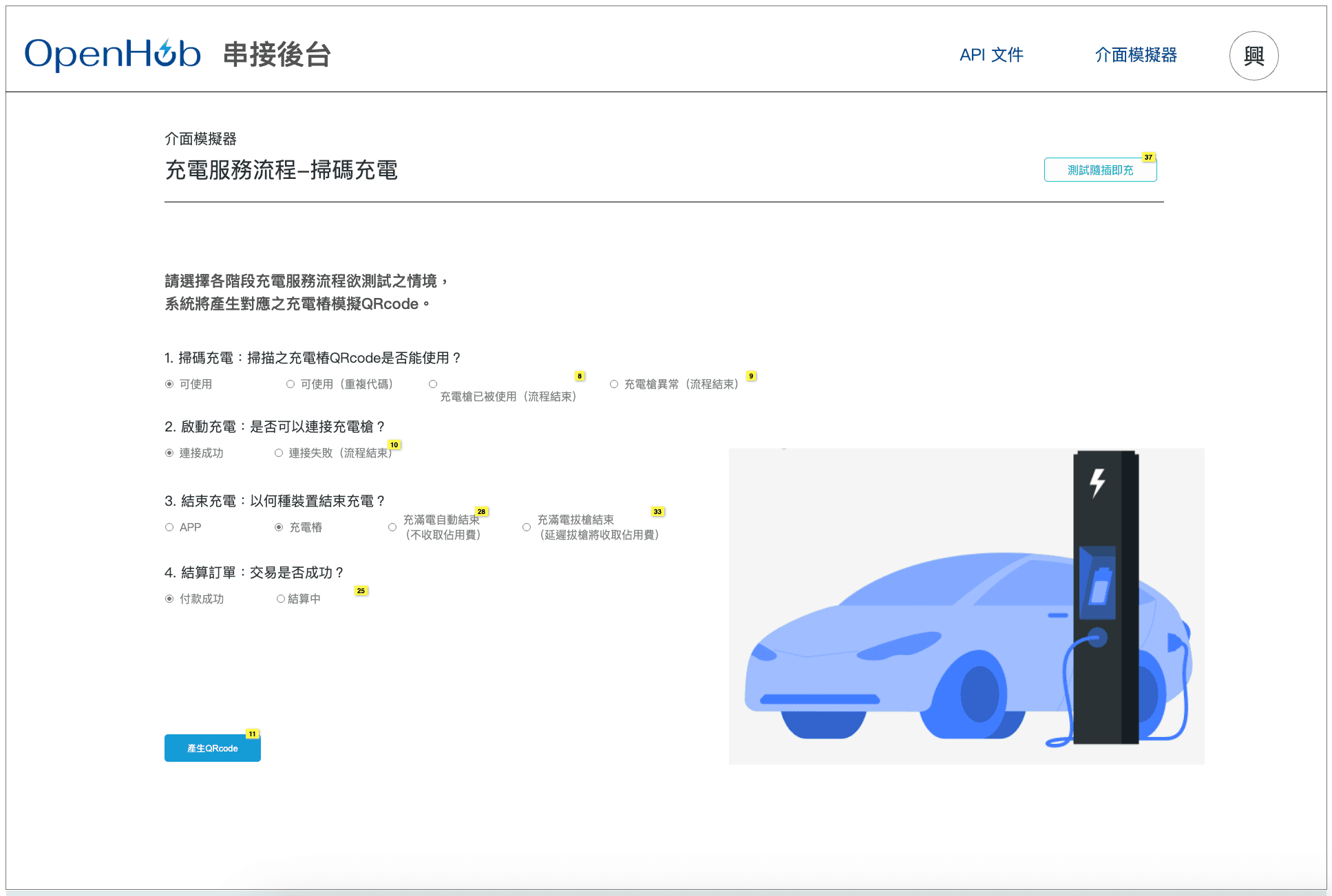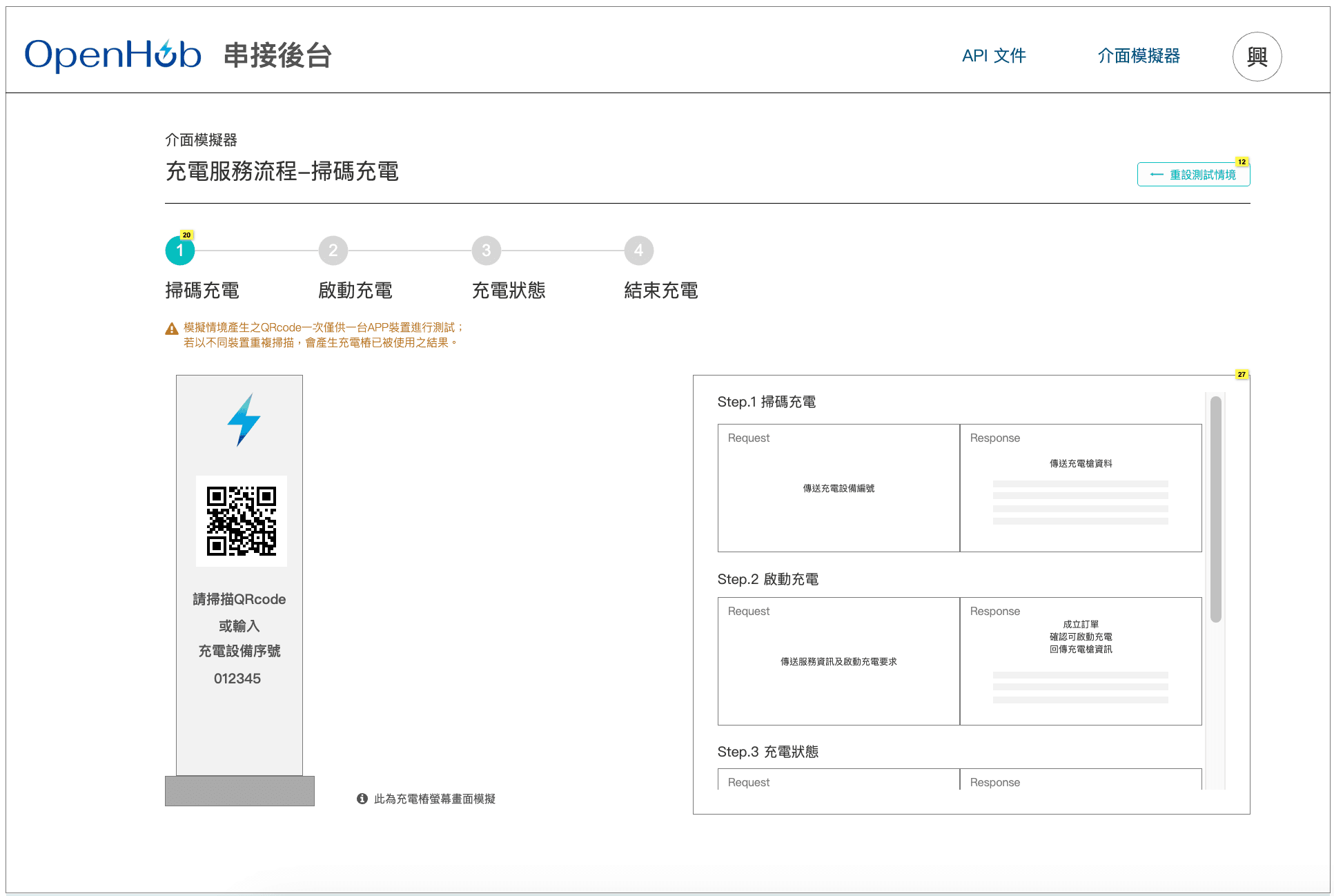 產品功能:提供開發者自行設定欲測試的充電情境腳本,系統會產生對應之充電樁QRcode。以其開發的APP掃描後即可展開充電服務測試,確認流程中畫面有無問題,並可取得由APP發送及接收之API資訊。