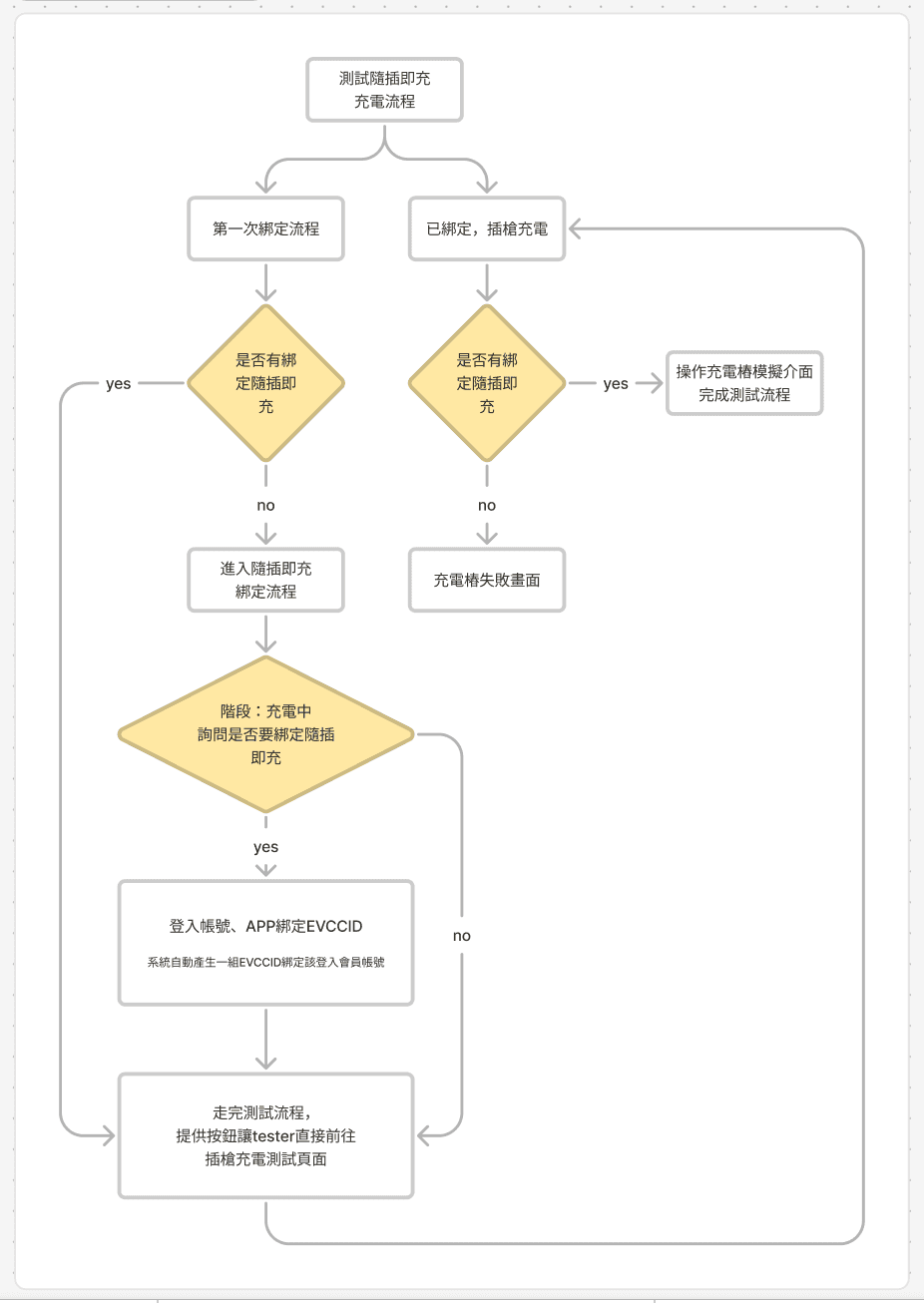 該流程會讓User進行掃碼充電,在進入充電中的狀態時,Server會發送是否綁定隨插即充的詢問,測試者透過APP按下綁定後,便可進行第二個測試腳本。