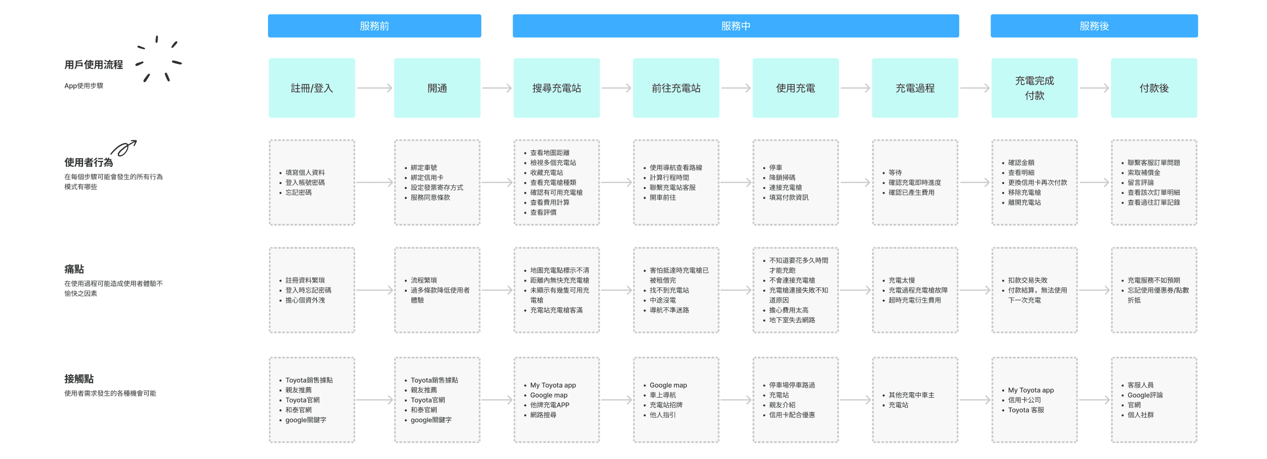 進入產品設計前,透過繪製用戶充電旅程,針對充電中可能發生的所有情境進行盤點。